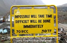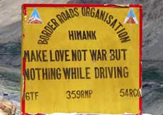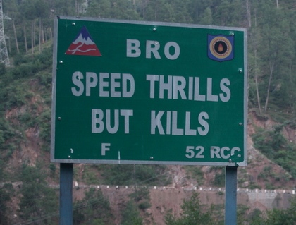 A road trip in the Himalayan foothills involves many things – adventure, fun, great views and most uniquely to India – road signs from our BRO. That is the Border Roads Organization and not Big Brother. So what is so special about these signs you may well ask? Is it the Indian penchant for misspelling or malapropism on our signage?  Well… the BRO signs are relatively free from misspellings (though there are a few exceptions)… but what makes them unique is the humorous and appealing manner in which drivers on the mountainous roads are reminded about road safety rules and principles. Take a gander at a few… (Images courtesy http://www.peeppeepdon’tsleep.com, http://www.fabsn.com and http://www.myvisionmyway.com). There are a few that warn one against drunk driving and try their hand at rhyming while they are at it… Image Image